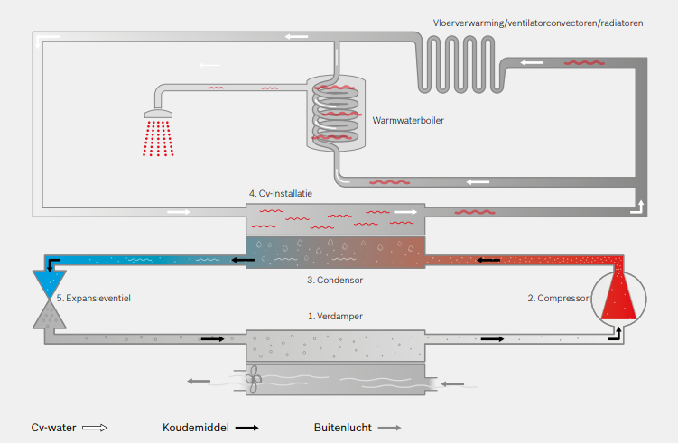 De binnenunit zorgt voor afgifte van deze warmte aan een C.V. circuit geschikt voor lage temperaturen.
